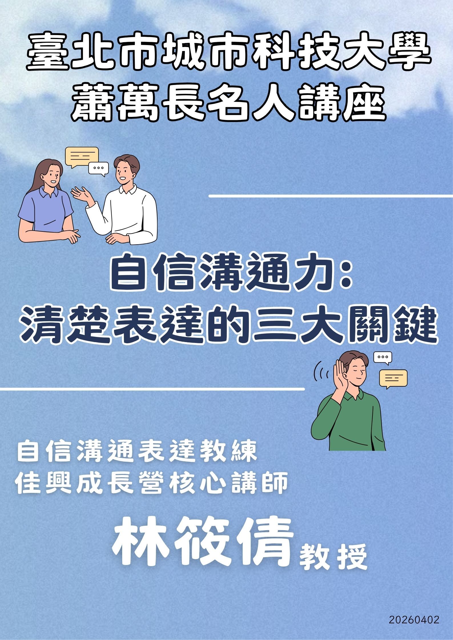 【通識】115年04月02日(四)名人講座邀請 林筱倩 自信溝通表達教練佳興成長營 核心講師 蒞校演講,歡迎有興趣的師生蒞臨參加!