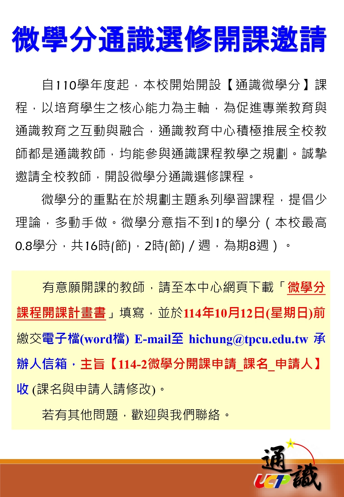 一、微學分課程,僅開設在日間部四技(平日白天上課),其餘學制目前沒有規劃開課。申請後,須經由校內會議通過後,方可開課。確定開課,會再通知老師並協助排課。授課教師須符合本校【通識教育中心教師授課專長認定實施準則】。