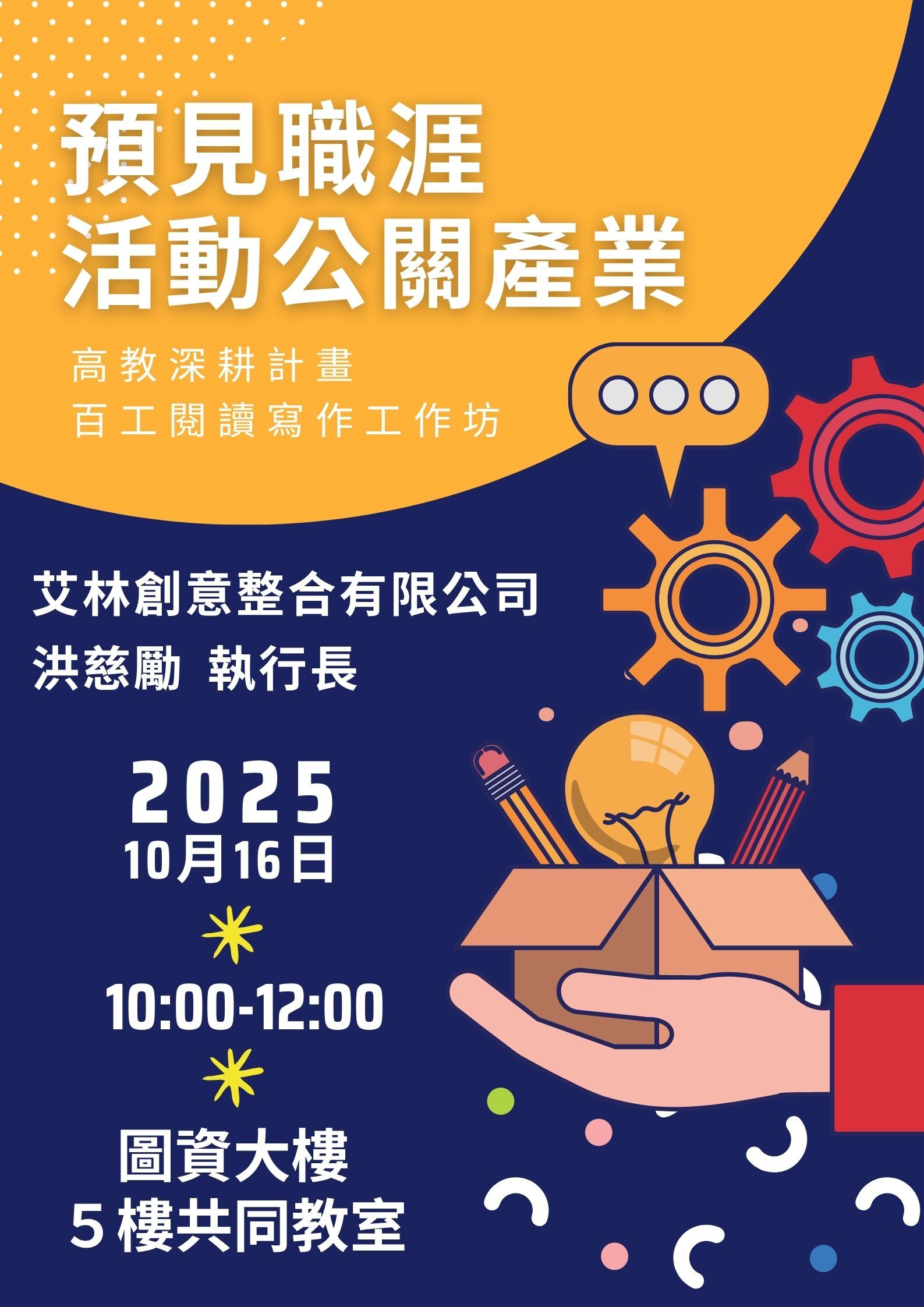 【通識】114年10月16日(四) 「百工閱讀工作坊」:遇見職涯-活動公關產業,歡迎有興趣的師生蒞臨參加!
