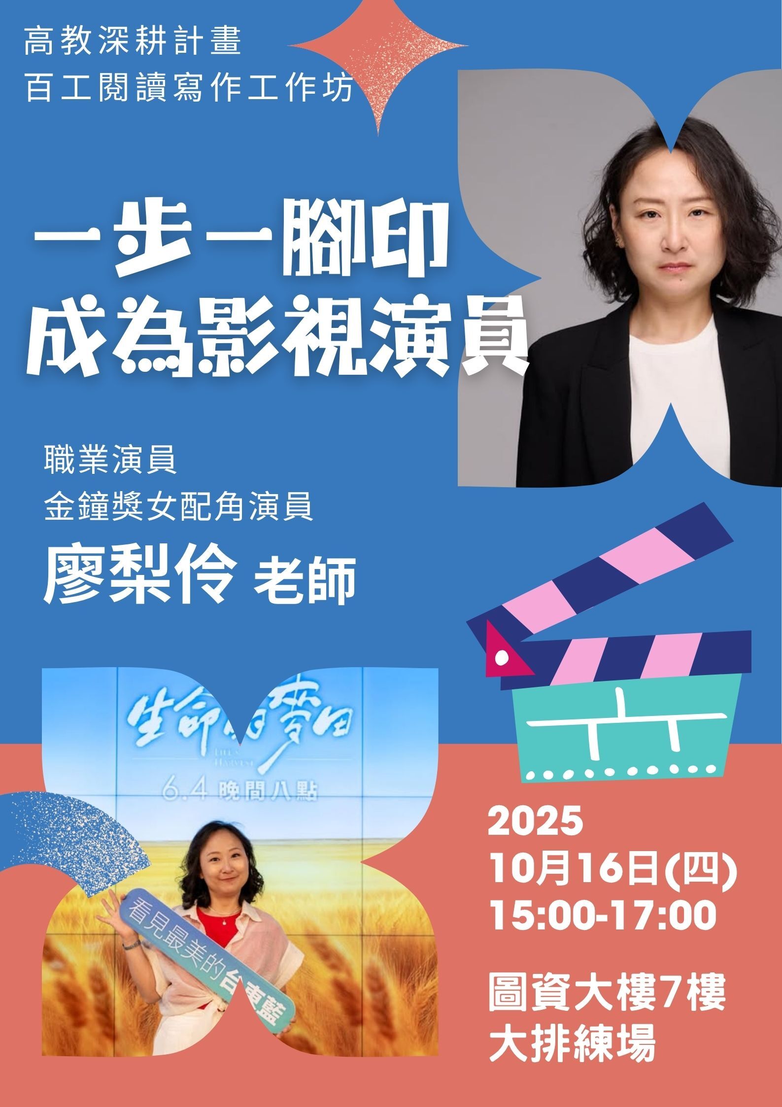 【通識】114年10月16日(四) 「百工閱讀工作坊」:一步一腳印-成為影視演員,歡迎有興趣的師生蒞臨參加!
