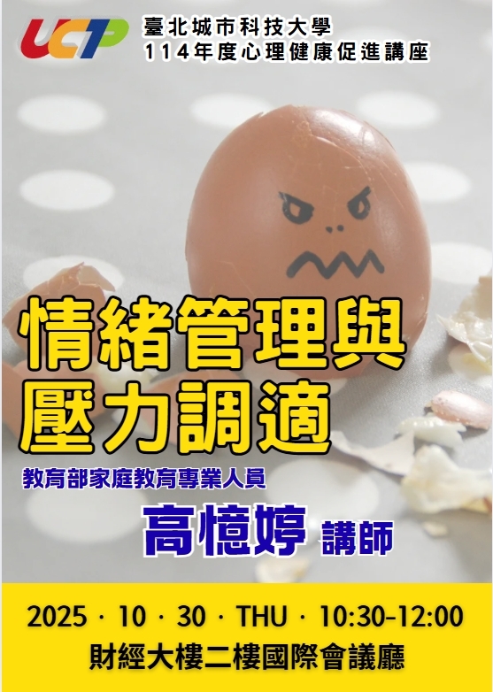 【通識】114年10月30日(四)心理健康促進專題講座「情緒管理與壓力調適」,歡迎有興趣的師生蒞臨參加!