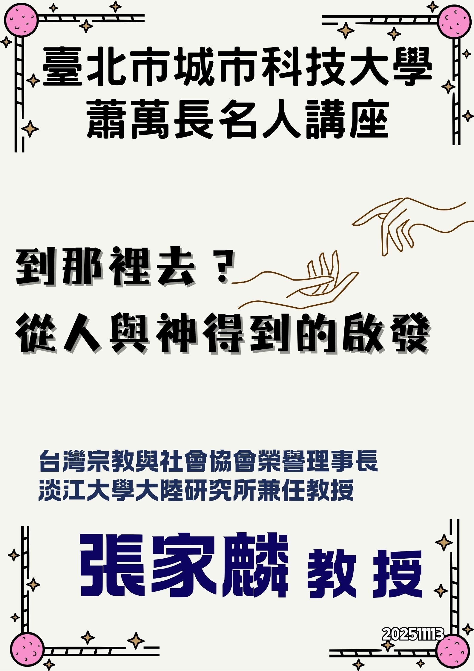 【通識】114年11月13日(四)名人講座邀請 台灣宗教與社會協會榮譽理事長 張家麟教授 蒞校演講,歡迎有興趣的師生蒞臨參加!
