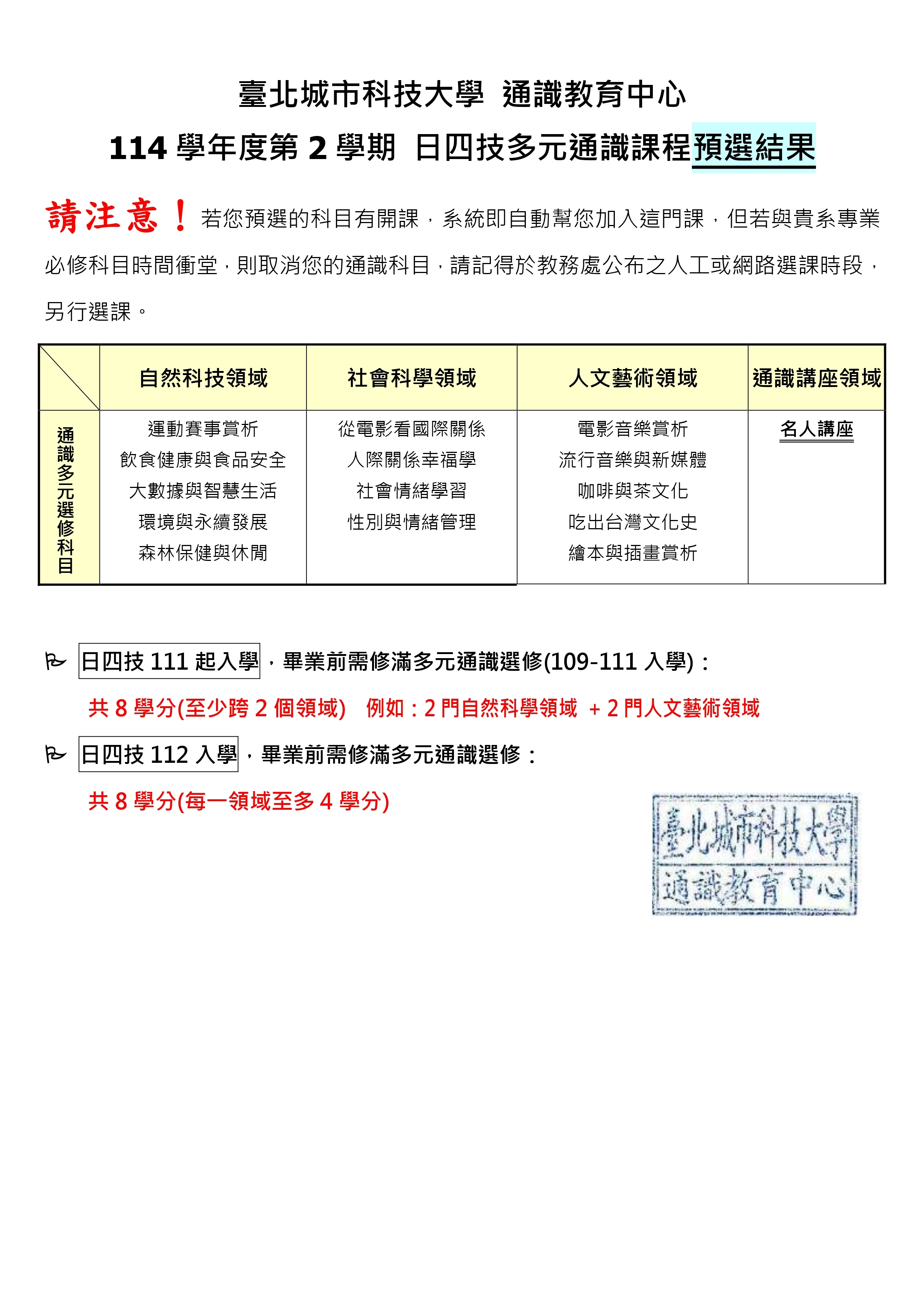 【通識】114-2日四技多元通識選修,預選結果出爐囉!