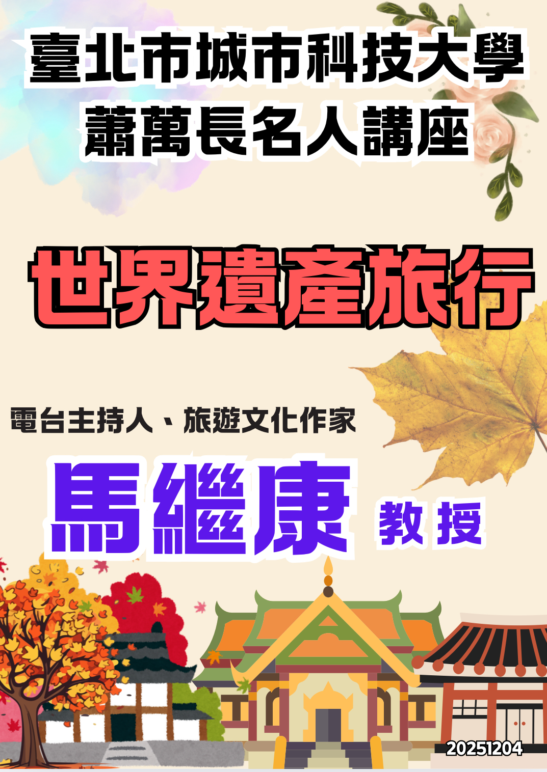【通識】114年12月4日(四)名人講座邀請電台主持人、旅遊文化作家 馬繼康教授 蒞校演講,歡迎有興趣的師生蒞臨參加!